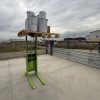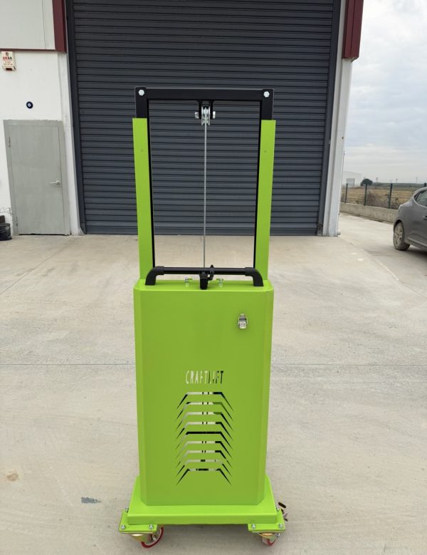 • Dikey mast + halat/makara kaldırma mekanizması: Üstte makara ve aşağı inen kablo/halat görülüyor; bu sistem yükü yukarı-aşağı alır (bazı modellerde elektrikli vinç, bazılarında manuel sistem olabilir).